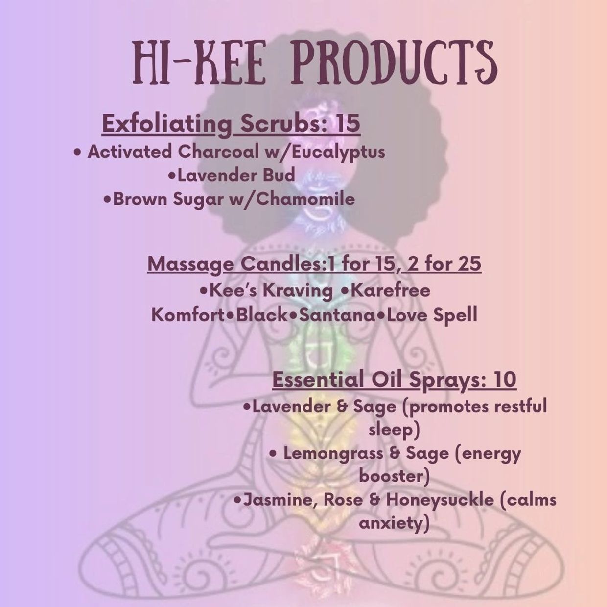 All products are handmade with high quality natural ingredients. Curated to enhance your self-care experience at home, on vacation or at work, you are bound to fall in love with our massage candles, essential oil aroma sprays and exfoliating scrubs. Ask about our new premium incense sticks!